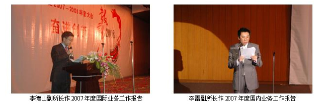 在振奮的年會(huì)開(kāi)場(chǎng)后,集佳李德山副所長(zhǎng)和李雷副所長(zhǎng)分別作了2007年度國(guó)際業(yè)務(wù)和國(guó)內(nèi)業(yè)務(wù)工作報(bào)告。2007年集佳商標(biāo)申請(qǐng)量持續(xù)七年保持國(guó)內(nèi)第一,進(jìn)口、出口商標(biāo)代理量繼續(xù)快速增長(zhǎng),出口專利量仍保持中國(guó)最大的成績(jī)?cè)僖淮斡∽C了集佳扎實(shí)、穩(wěn)健、持續(xù)、快速的發(fā)展歷程,讓在場(chǎng)的每一個(gè)集佳人感到驕傲和振奮。而合伙人和初級(jí)合伙人的逐步增加,擁有了國(guó)內(nèi)最頂尖的電學(xué)代理人團(tuán)隊(duì)以及管理團(tuán)隊(duì)的高效運(yùn)轉(zhuǎn),更讓我們看到,集佳的理念和發(fā)展前景吸引了越來(lái)越多的精英共創(chuàng)偉業(yè)。