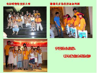 為了減少孩子們對新環境的害羞和陌生感。集佳律師事務所特意安排了年齡相仿的7名律師子女的孩子作為寧夏小朋友的陪同小伙伴。一路上孩子們相互了解,相互關照,北京的小朋友主動的承擔起小導游,為寧夏小伙伴介紹新北京,新奧運。歡歌笑語聲中,羞澀的寧夏小朋友也在不知不覺中拋開了膽怯和陌生,臉上綻放出燦爛的笑容。