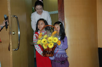 兩個可愛的小朋友獻花給米春梅阿姨表示祝福和感謝