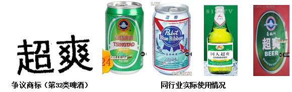 申請(qǐng)理由和法律依據(jù):自上世紀(jì)90年代中期開始,“超爽”作為描述啤酒口味的詞匯,在啤酒行業(yè)內(nèi)廣泛使用,故“超爽”成為僅僅直接表示了指定使用商品的風(fēng)格特點(diǎn)用語(yǔ),不得作為商標(biāo)注冊(cè)。為保障行業(yè)內(nèi)的有序競(jìng)爭(zhēng),申請(qǐng)人依據(jù)修改前的《商標(biāo)法》第十條第二款等規(guī)定,請(qǐng)求撤銷爭(zhēng)議商標(biāo)的注冊(cè)。被申請(qǐng)人答辯稱:爭(zhēng)議商標(biāo)為被申請(qǐng)人獨(dú)創(chuàng),并非啤酒行業(yè)通用名稱,也不是國(guó)家標(biāo)準(zhǔn)所規(guī)范的表示啤酒口感的描述性文字,故應(yīng)予維持注冊(cè)。