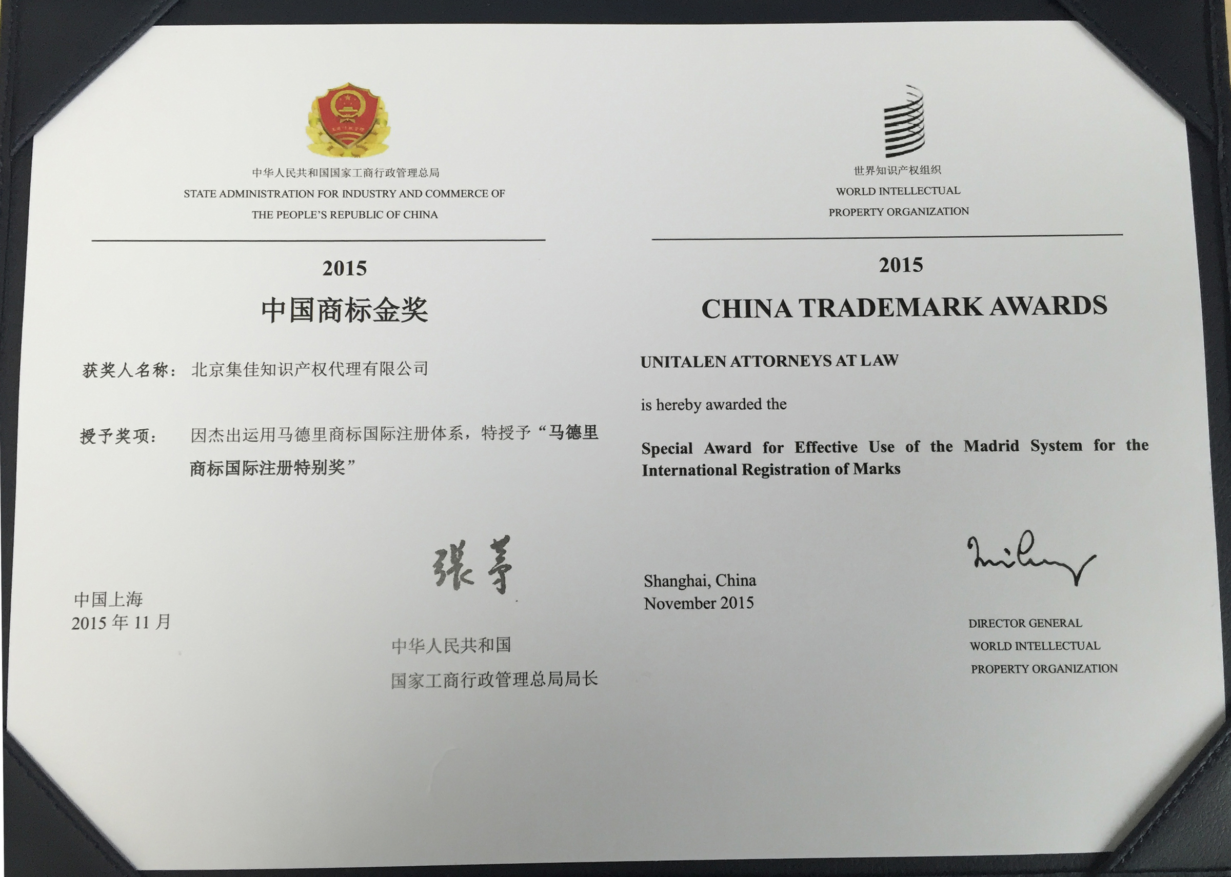 于澤輝所長代表公司參加了此次表彰大會。因杰出運用馬德里商標國際注冊體系,國家工商總局和世界知識產權組織特授予集佳“馬德里商標國際注冊特別獎”。據悉,集佳是國內唯一一個代理機構榮獲此獎項。
