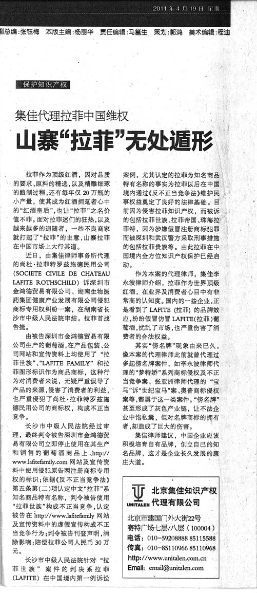 《國際商報》:集佳代理拉菲中國維權