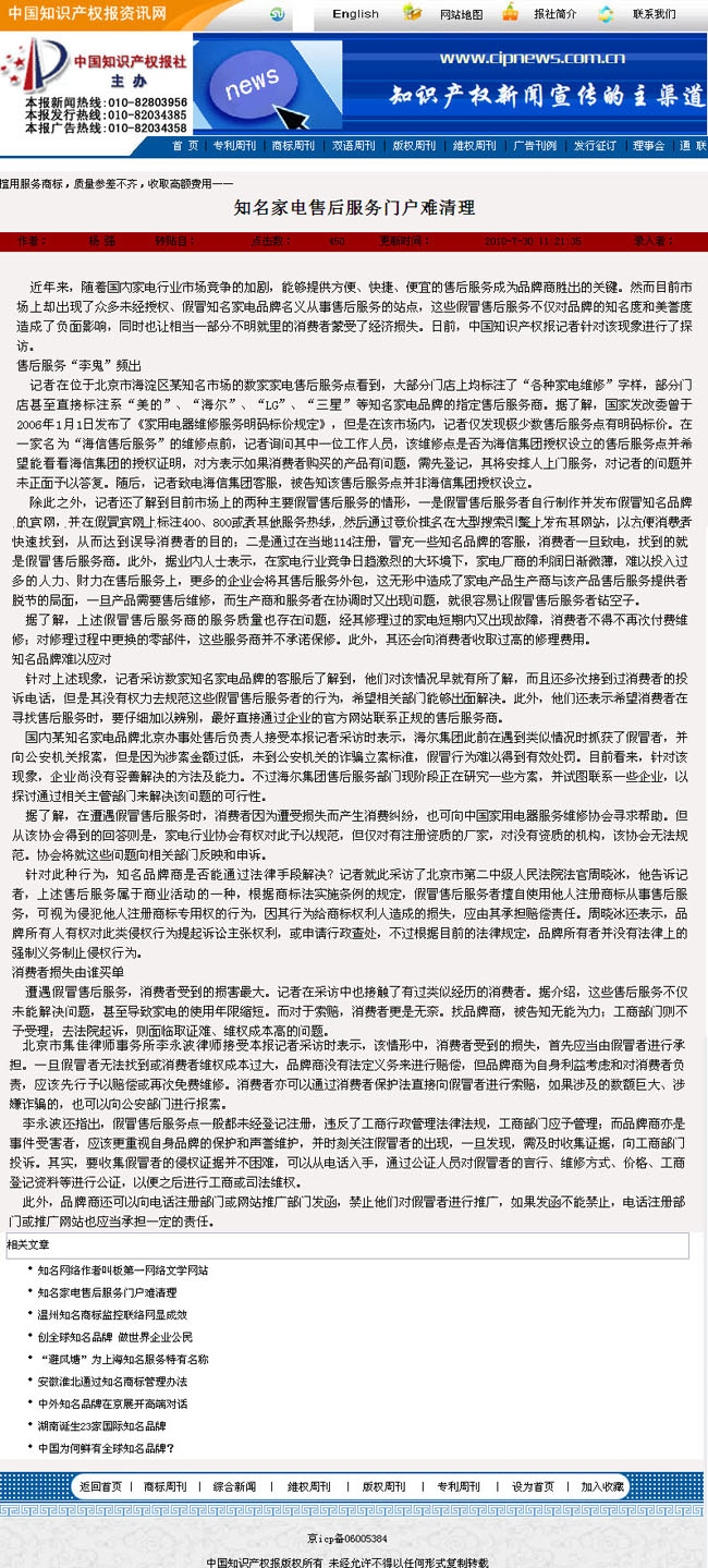 中國知識產權報資訊網:知名家電售后服務門戶難處理