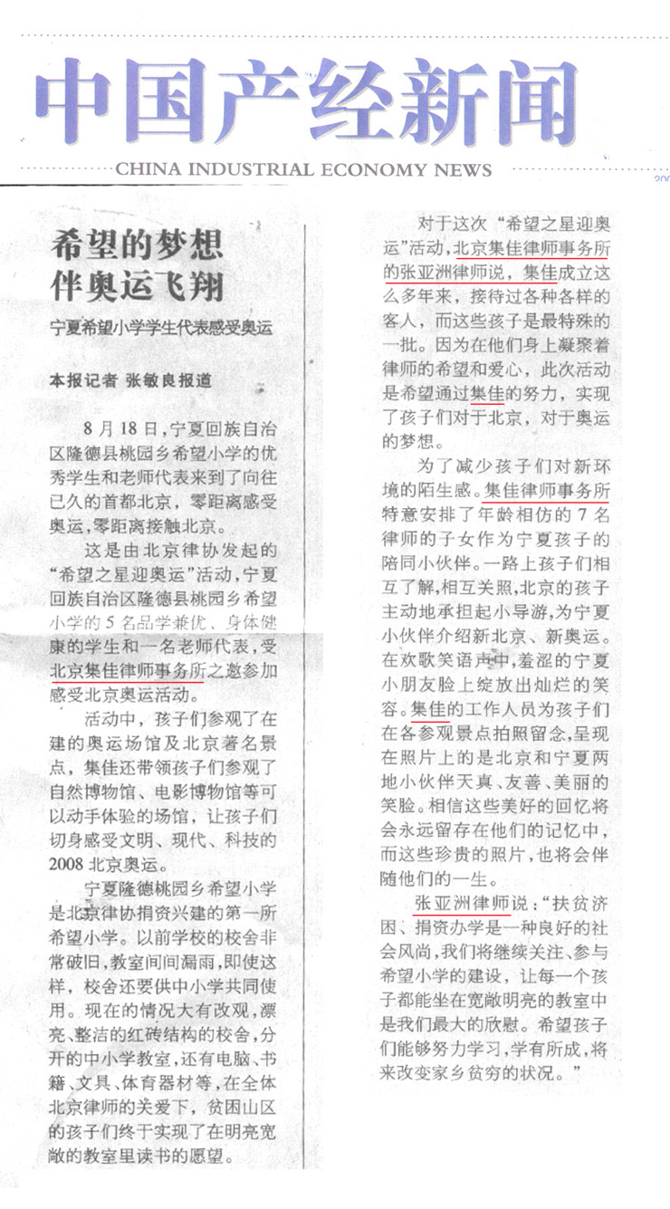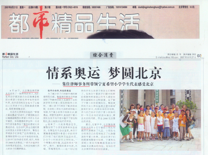 《中國(guó)產(chǎn)經(jīng)新聞》、《都市精品生活》:集佳律師事務(wù)所帶領(lǐng)寧夏希望小學(xué)學(xué)生代表感受北京