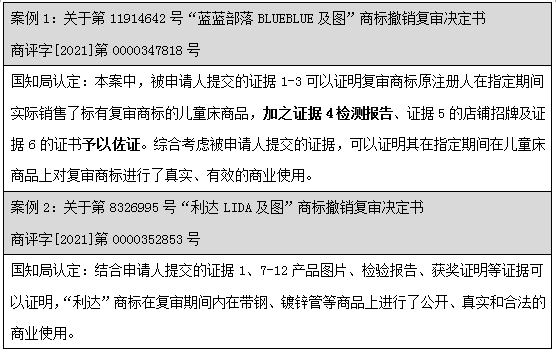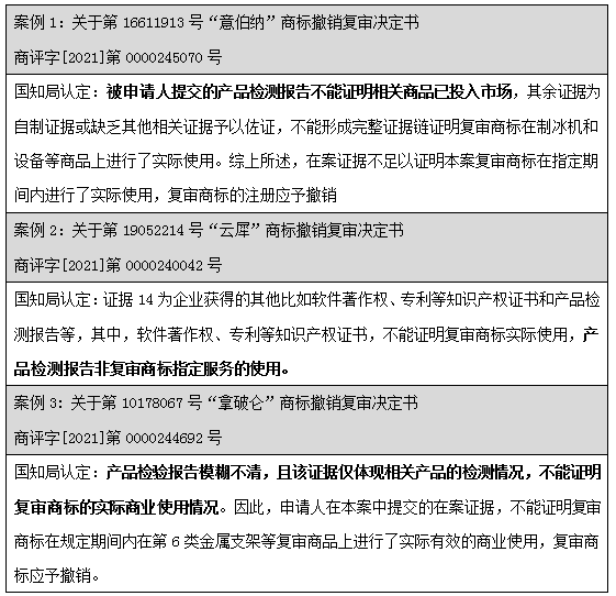 通過(guò)上述案例可見(jiàn),不論是國(guó)知局還是法院階段,均有大量的裁定及判決直接認(rèn)定:產(chǎn)品檢測(cè)報(bào)告僅為產(chǎn)品檢測(cè)情況,無(wú)法證明商品進(jìn)入市場(chǎng)流通流域,不應(yīng)認(rèn)定為商標(biāo)法意義上的使用證據(jù)。但是針對(duì)該問(wèn)題并沒(méi)有統(tǒng)一的裁判標(biāo)準(zhǔn),司法實(shí)踐中,也不乏案件綜合考量了產(chǎn)品檢測(cè)報(bào)告。部分案例列舉如下: