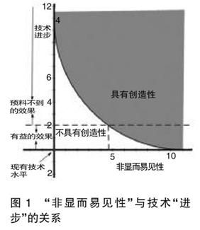 通常,當要求保護的發明相對于現有技術的非顯而易見性越低,則對發明欲具備創造性所需的技術效果的要求就越高。這一關系可以簡單地用圖1表示【4】。所以,在效果達不到“量”的預料不到的程度時,可以在進一步限定技術方案、增加區別技術特征的基礎上(由于相關變量的增加而并非有限次實驗就可容易得到),使該技術方案的非顯而易見性提高,再結合“明顯”的優異效果,來爭論創造性。
