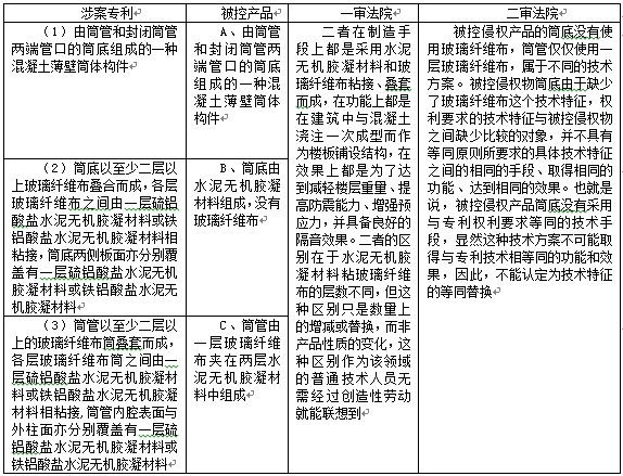 該案的焦點問題在于,被控產品技術特征C與涉案專利技術特征(3)相比是否構成等同特征的判斷。也就是說,被控產品筒體的“玻璃纖維布夾”是否為權利要求中記載的管玻璃纖維布層數為“不少于二層”為等同特征。