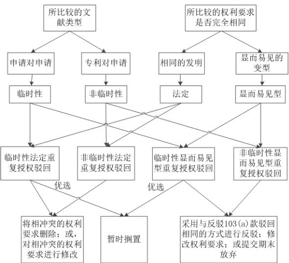 重復(fù)授權(quán)按照所比較的文獻(xiàn)類型分為臨時性重復(fù)授權(quán)和非臨時性重復(fù)授權(quán)。重復(fù)授權(quán)按照所比較的權(quán)利要求是否完全相同分為法定重復(fù)授權(quán)和非法定重復(fù)授權(quán)。