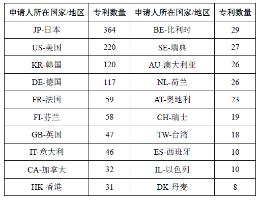 根據表3(僅列出申請量前20位的國家或地區),共有49個國家或地區在固廢領域在華進行了專利布局,共計1367件,僅占分析專利總量的3.5%左右,這表明該領域的專利申請人主要集中在國內。隨著固廢領域技術的不斷發展,競爭的不斷加劇,市場的不斷發掘和擴大,相信國外主體也會越來越多地進行在華布局。