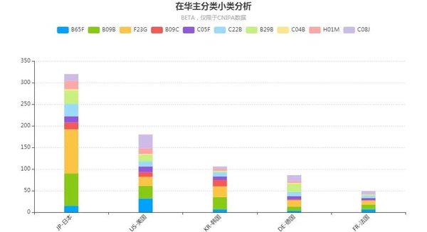 由上文可知,國外申請人在國內固廢領域的布局較少,前五個布局國家各自的技術布局如圖7所示。由圖可知,除了日本存在兩個較明顯的優勢小類布局之外,其余幾個國家的技術布局雖然各有側重,但均比較分散。與圖2相比,五個國外申請主體中只有美國以B65F(家庭的或類似的垃圾的收集或清除,其在分析專利總量中排名第一)為主,部分反映出美國企業在固廢收集方面的出海優勢。還注意到,日本企業以F23G(焚化爐;廢物或低品位燃料的焚毀)和B09B(固體廢物的處理)為主進行布局,這與日本在垃圾焚燒和處理方面的技術成熟程度一致。
