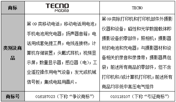 ”第09類商標注冊申請。2017年08月18日,英國公司PDJ (Shelf 7) Limited在前述商標初審公告期內基于名下第010118107號“TECNO”第09;36;37類在先歐盟注冊商標、援引《歐盟商標條例》第8(1)(b)條即混淆誤認條款對前述商標提出了異議。為此,將雙方商標和商品對比如下表: