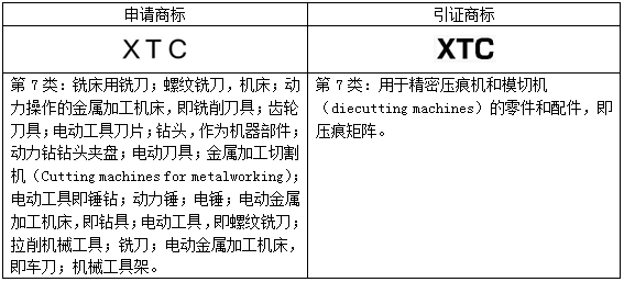 “XTC”商標第01;06;07類美國商標申請被引證上述相同英國公司C&T MATRIX LIMITED名下的第7類在先商標下發駁回,同樣部分駁回了申請商標在第7類商品上的申請注冊。申請商標和引證商標信息具體如下: