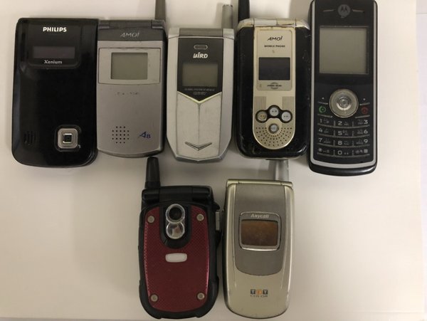 (請求人提交七款舊手機(jī)試圖作為使用公開證據(jù),從左至右、從上到下依次為:飛利浦9@9r、夏新A8、波導(dǎo)V08、夏新M66、摩托羅拉W161、松下X77、三星SGH-S508)