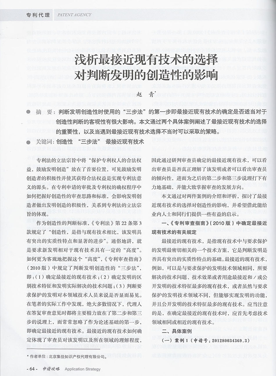 集佳文章《淺析最接近現有技術的選擇對判斷發明的創造性的影響》在《專利代理》發表