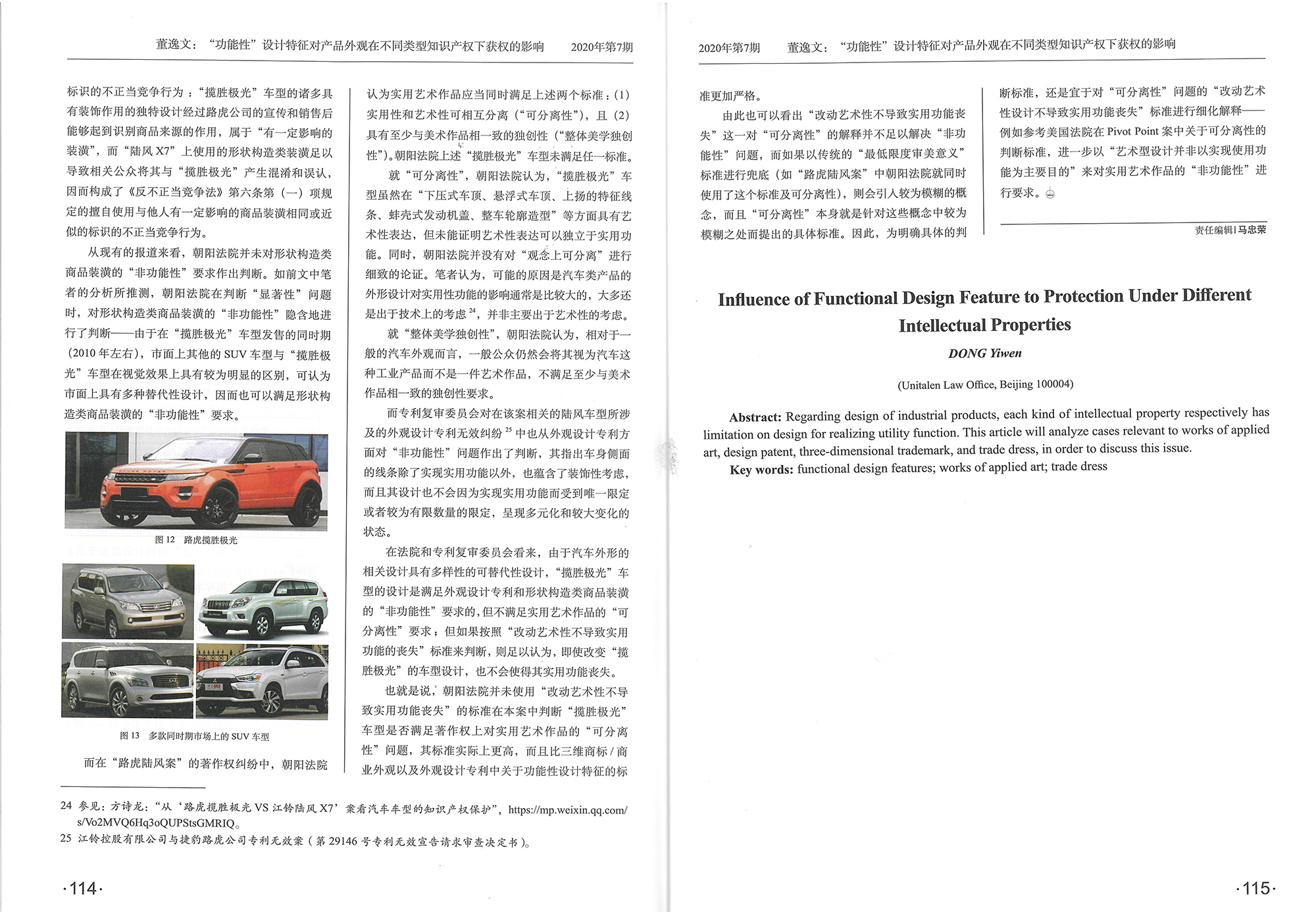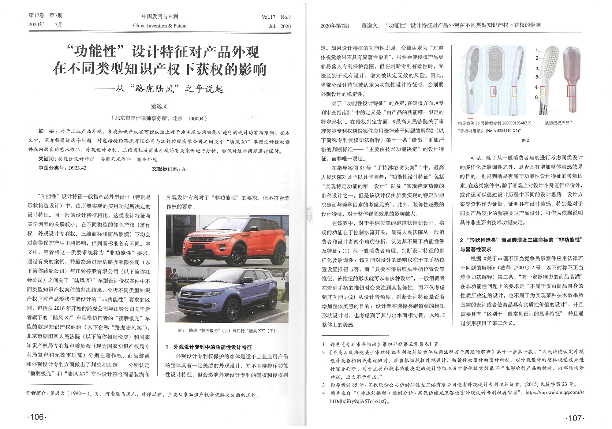 集佳文章《“功能性”設計特征對產品外觀在不同類型知識產權下獲權的影響——從“路虎陸風”之爭說起》在《中國發明與專利》發表
