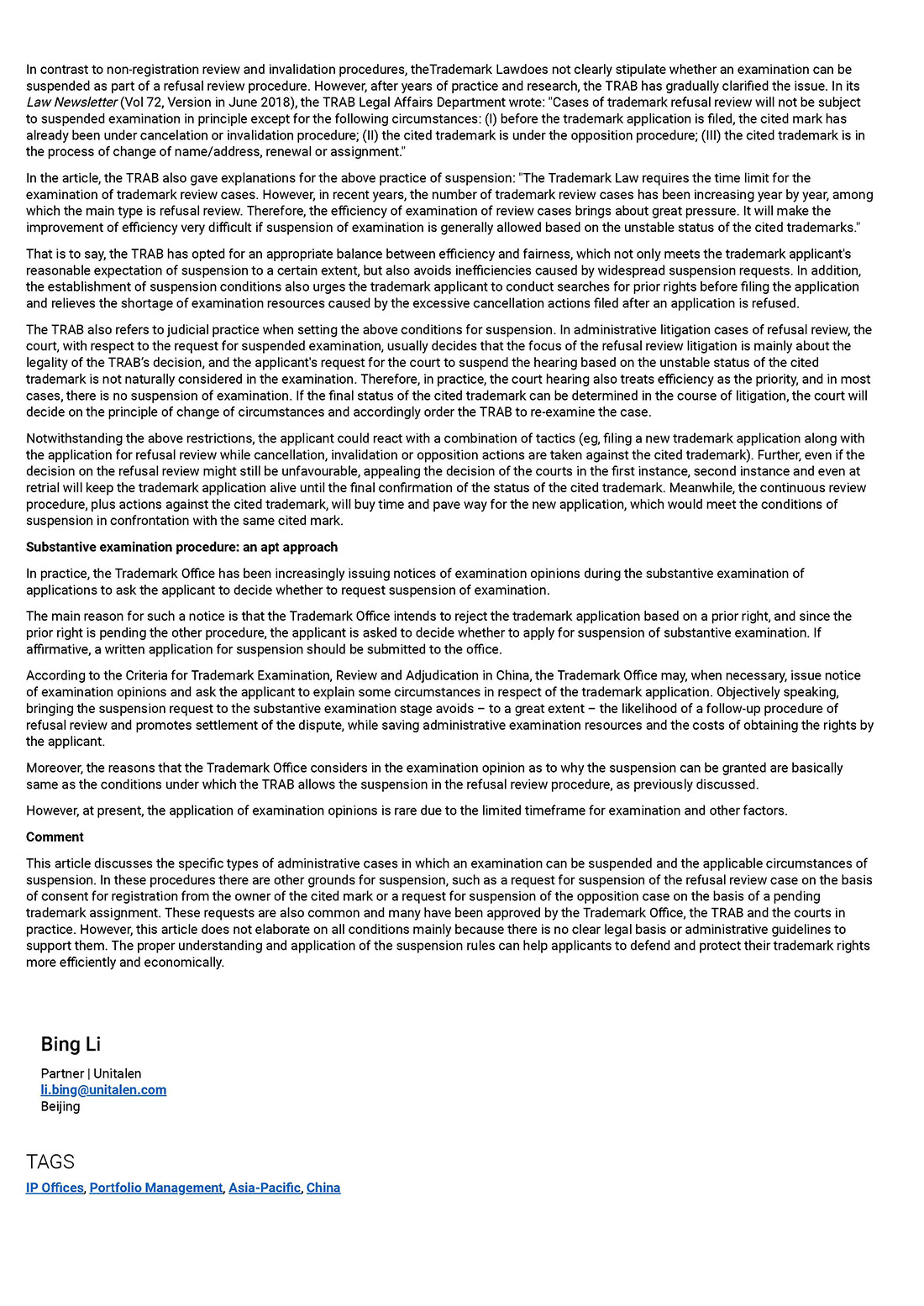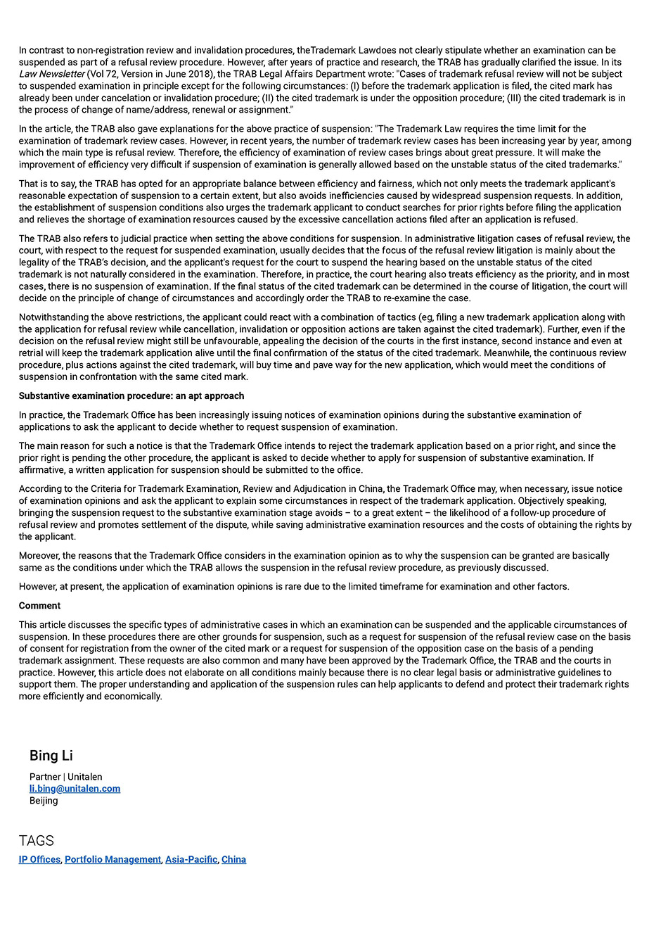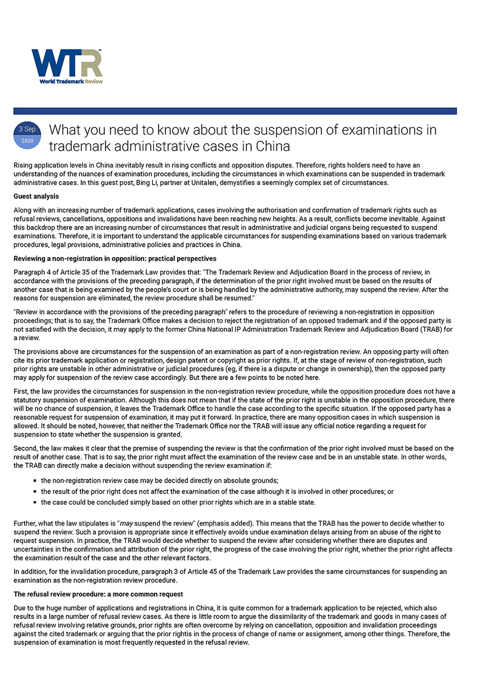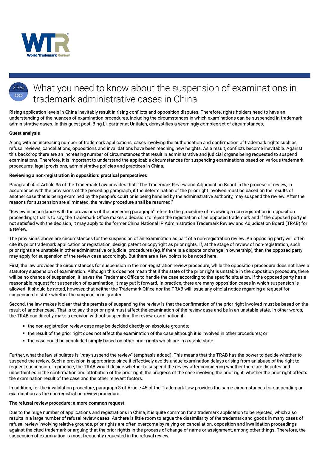 集佳文章《What you need to know about the suspension of examinations in trademark administrative cases in China》在《WTR》發表