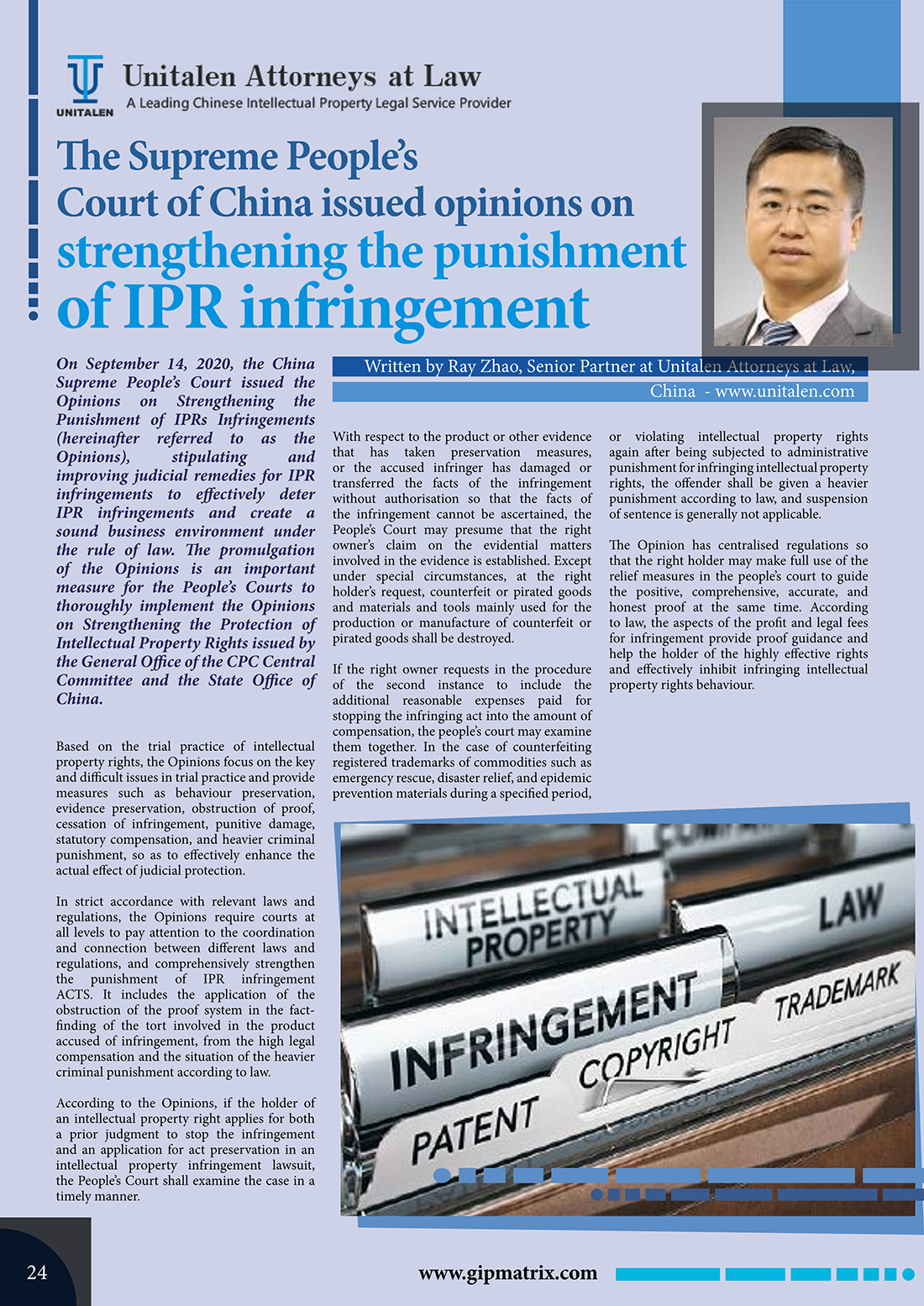 集佳文章《The Supreme People’s Court of China issued opinions on strengthening the punishment of IPR infringement》在《The Global Ip》發(fā)表