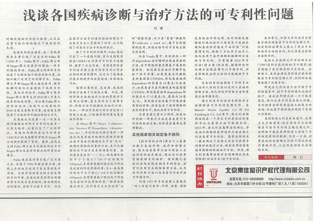 集佳文章《各國疾病診斷與治療方法的可專利性問題》在《中國知識產權報》發表