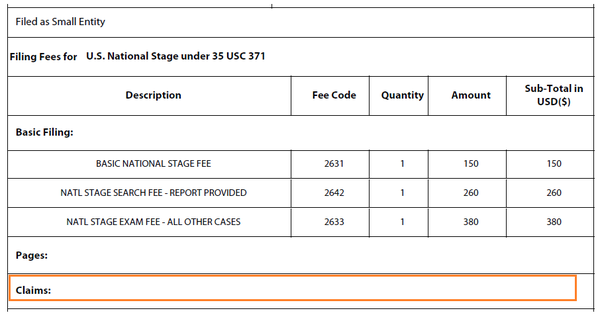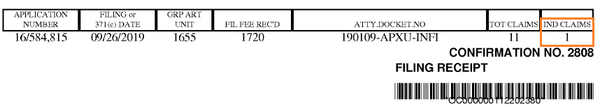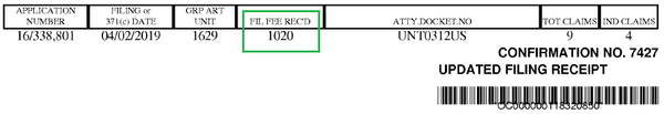 在USPTO發(fā)出的受理通知書上,可以看到官方認定的獨立權利要求數(shù)為4,同時顯示官方收到的申請人費用(綠色方框),參見下圖: