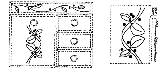 而如果一件外觀設計的保護客體僅在于表面圖案,那么其必須以產品為載體,這也相當于一種局部外觀設計了。這種情況下也是用虛線來表示產品的輪廓,下方圖4是Design Patent Application Guide中的示例,所保護的是珠寶盒上的表面圖案。