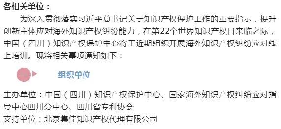 2022年4月20日,由中國(四川)知識產權保護中心、國家海外知識產權糾紛應對指導中心四川分中心、四川省專利協會主辦,北京集佳知識產權代理有限公司協辦的“中國企業如何有效應對海外專利糾紛”專題培訓線上分享會成功舉辦。