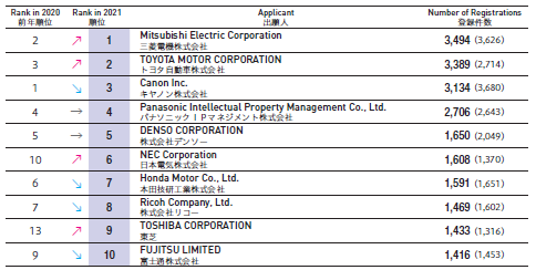 前10大日本國內企業發明專利注冊量: