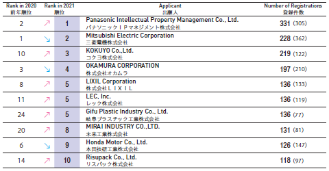 前10大日本國內企業外觀設計注冊量: