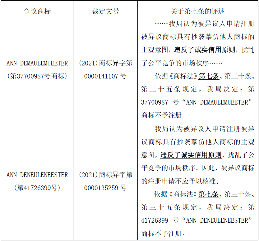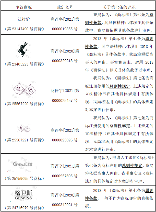 而在過往大多數異議、無效宣告案件中,“誠實信用原則”都被評價為“總則性條款”或“原則性條款”,例如,下表所列的6件無效宣告案件均將申請人基于第七條的評審請求評述為“總則性條款”,認為誠實信用原則具體精神已體現在其他條款中,案件需依據其他具體性條款進行評價: