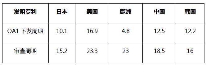 2021年五局發(fā)明OA1平均下發(fā)周期及平均審查周期對(duì)比:(單位:月)