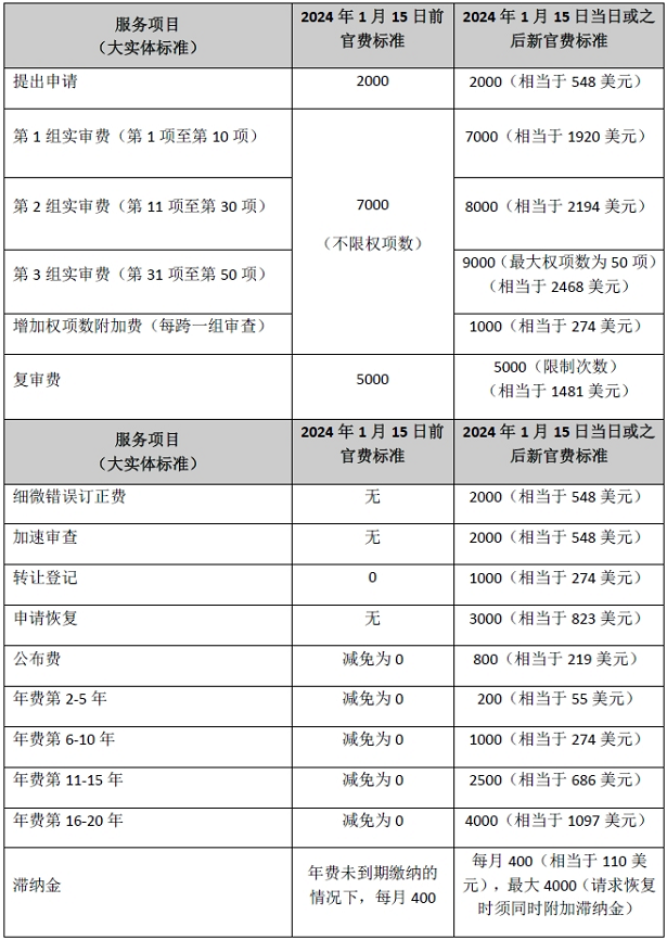 2023年11月15日,阿拉伯聯合酋長國(簡稱阿聯酋)經濟部在官方公報中發布2023年第112號決議,宣布對專利、實用新型、工業外觀設計以及集成電路圖的官費進行調整,將征收一批新官費項目,如加速審查費用、超項審查費等,并恢復了一些之前取消的官費收費項目,如年費、公告費等。新官費標準已于2024年1月15日生效實施,發明專利申請中主要涉及的官費調整內容如下表所示:
