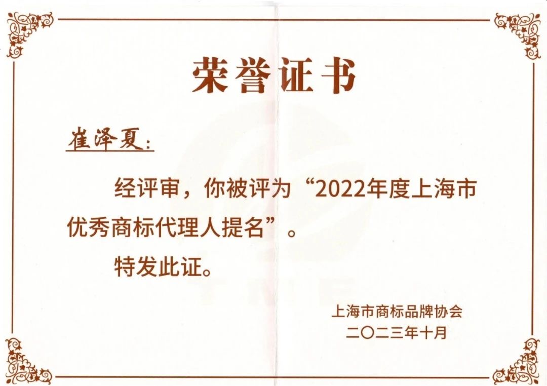 集佳上海分所崔澤夏律師獲得2022年度“上海市優(yōu)秀商標(biāo)代理人提名”。