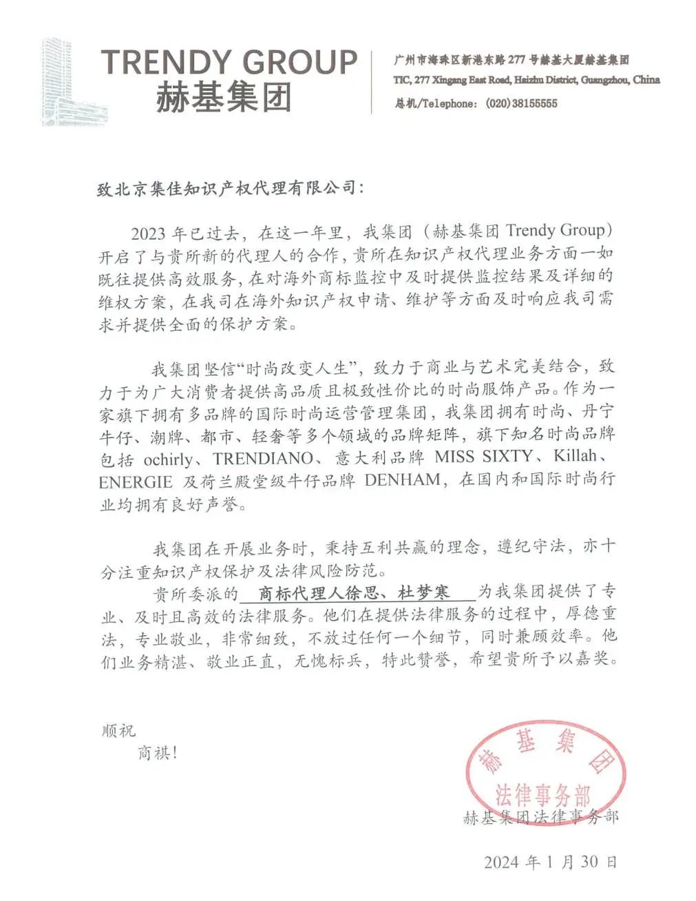 信中提到,2023年,集佳與赫基集團(tuán)在專利保護(hù)和維權(quán)、商標(biāo)維權(quán)方面更進(jìn)一步加強(qiáng)合作,集佳一如既往、迅速地為赫基集團(tuán)提供了專業(yè)的知識(shí)產(chǎn)權(quán)保護(hù)建議,集佳提供的實(shí)操性強(qiáng)、專業(yè)性高的保護(hù)及維權(quán)方案,為赫基集團(tuán)的生產(chǎn)、經(jīng)營、管理和其他活動(dòng)方面都提供了全方位的法律幫助。赫基集團(tuán)法務(wù)部贊揚(yáng)集佳張亞洲律師、李用航律師、董逸文律師、徐思律師、商標(biāo)代理人杜夢寒等,在提供專業(yè)、及時(shí)且高效的法律服務(wù)的過程中,厚德重法,業(yè)務(wù)精湛,敬業(yè)正直,無愧標(biāo)兵。