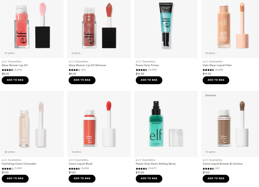 (E.l.f.在Ulta平臺的暢銷產品及其定價。截自Ulta平臺)