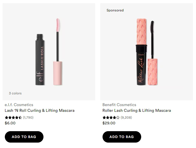 (雙方爭議商品。左為E.l.f.“Lash 'N Roll”睫毛膏,右為貝玲妃“Roller Lash”睫毛膏。截自Ulta平臺)