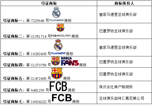 EL CLASICO MCF FCB及圖”(指定顏色)商標由皇家馬德里足球俱樂部(REAL MADRID CLUB DE FUTBOL,簡稱“皇馬”)和巴塞羅納足球俱樂部(FUTBOL CLUB BARCELONA,簡稱“巴薩”)作為共同申請人申請,商標構成同時包括皇馬和巴薩雙方的隊徽“
