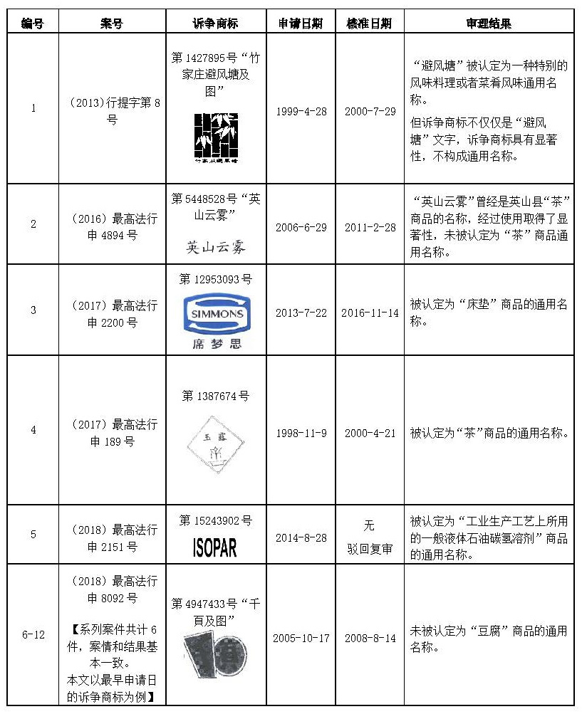 經查閱從2015年至今,中國裁判文書網收錄最高人民法院涉及“通用名稱”商標確權案件的行政裁判文書共計12份,包括11份行政裁定書和1份行政判決書,裁判作出的時間是2015年至2019年。筆者以這些文書為研究樣本,分析商標確權中法院認定通用名稱的考量因素和裁判標準。