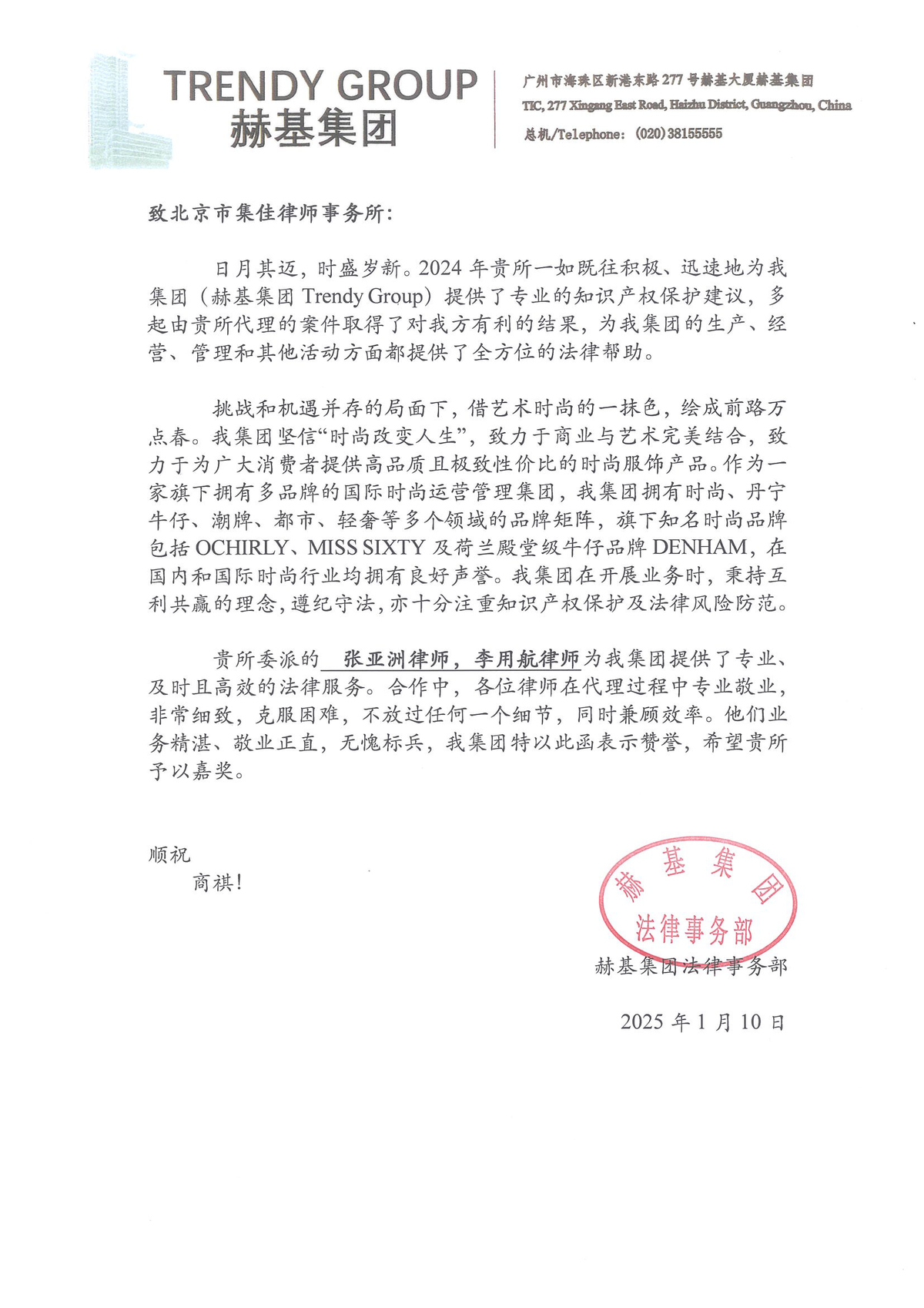 信中指出,集佳在2024年一如既往、迅速地為赫基集團提供了專業(yè)的知識產(chǎn)權(quán)保護建議,多起由集佳代理的案件取得了對赫基集團有利的結(jié)果,為赫基集團的生產(chǎn)、經(jīng)營、管理和其他活動方面都提供了全方位的法律幫助。