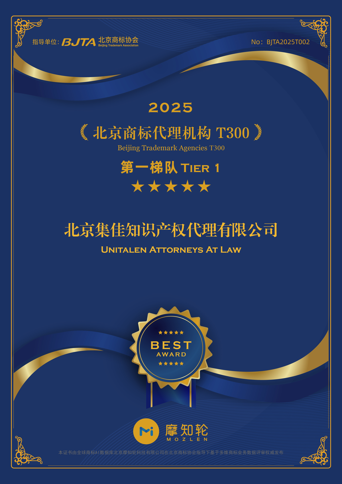 Unitalen Ranked in Tier 1 of the "Beijing Trademark Agencies T300 for 2025" List with Honor
