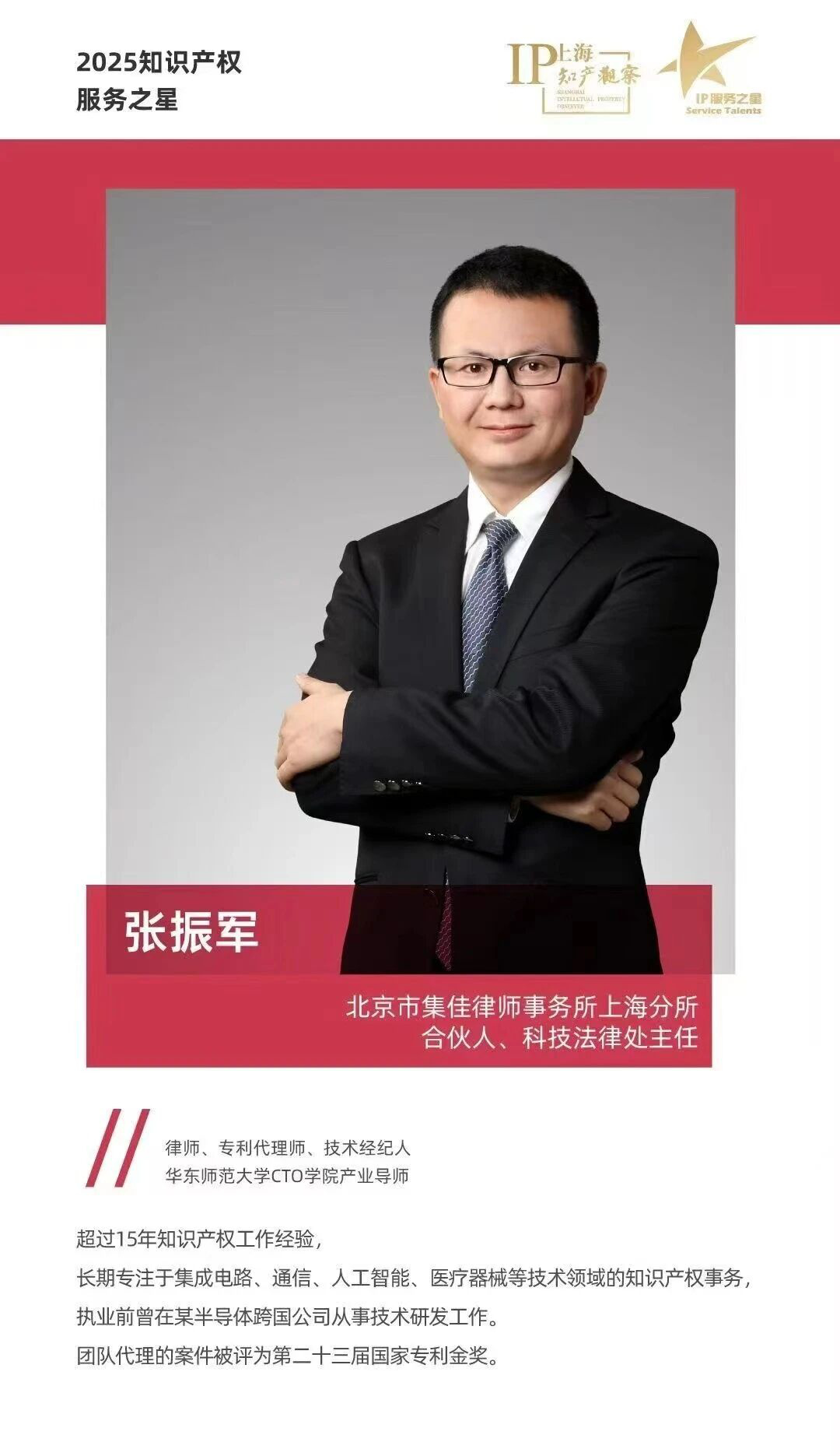 集佳上海分所張振軍律師憑借卓越的服務能力與良好的客戶口碑獲評“2025知識產權服務之星”。