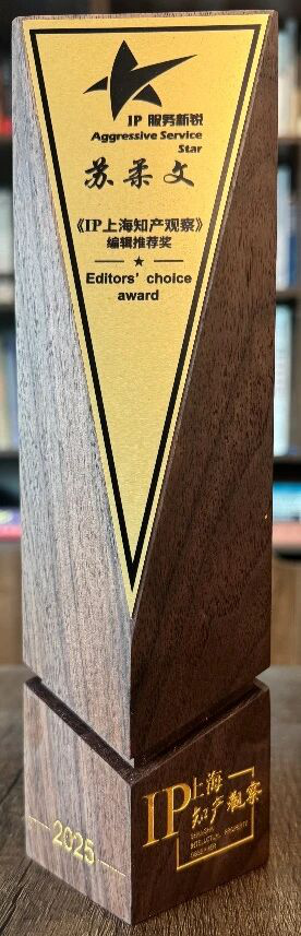 集佳上海分所蘇柔文律師憑借優秀的專業素養與突出的業務表現獲評“2025知識產權服務新銳”。